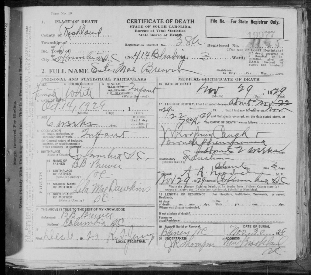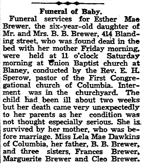 Funeral services for Esther Mae Brewer, the six-year*-old daughter of Mr. and Mrs. B. B. Brewer, 414 Blanding street, who was found dead in the bed with her mother Friday morning, were held at 11 o’clock Saturday morning at Union Baptist church at Blaney, conducted by the Rev. E. H. Sperow, pastor of the First Congregational church of Columbia. Interment was in the churchyard. The child had been ill about two weeks but her death came very unexpectedly to her parents as her condition was not thought especially serious. She is survived by her mother, who was before marriage, Miss Lela Mae Dawkins of Columbia, her father, B. B. Brewer, and three sisters, Frances Brewer, Marguerite Brewer and Cleo Brewer.