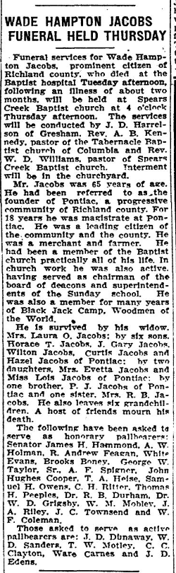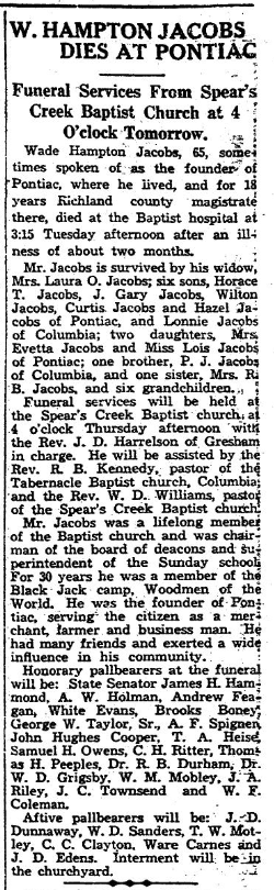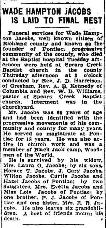 Funearl services for Wade Hampton Jacobs, well known citizen of Richland county and known as the founder of Pontiac, progressive community of the county, who died at the baptist hospital Tuesday afternoon were held at Spears creek Baptist church in the county Thursday afternoon at 3 o’clock conducted by Rev. J. D. Harrelson, of Gresham, Rev. A. B. Kennedy of Columbia, and Rev. W. D. Williams, pastor of Spears Creek Baptist church. Interment was in the churchyard.