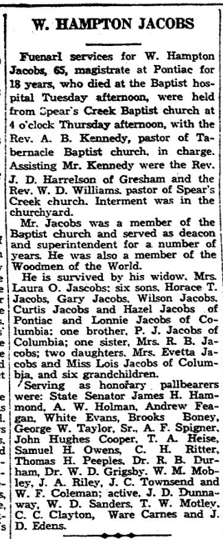 Funeral services W. Hampton Jacobs, 65, magistrate at Pontiac for 18 years, who died at the Baptist hospital Tuesday afternoon, were held from Spear’s Creek Baptist Church at 4 o’clock Thursday afternoon, with the Rev. A. B. Kennedy, pastor of Tabernacle Baptist church, in charge. Assisting Mr. Kennedy were the Rev. J. D. Harrelson of Gresham and the Rev. W. D. Williams, pastor of Spears Creek Baptist church. Interment was in the churchyard.