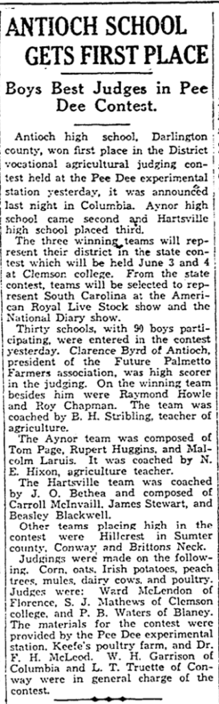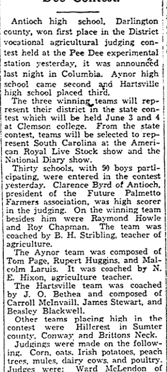 Thirty schools, with 90 boys participating, were entered in the contest yesterday. Clarence Byrd of Antioch, president of the Future Palmetto Farmers association, was high scorer in the judging. On the winning team besides him were Raymond Howle and Roy Chapman. The team was coached by B. H. Stribling, teacher of agriculture.