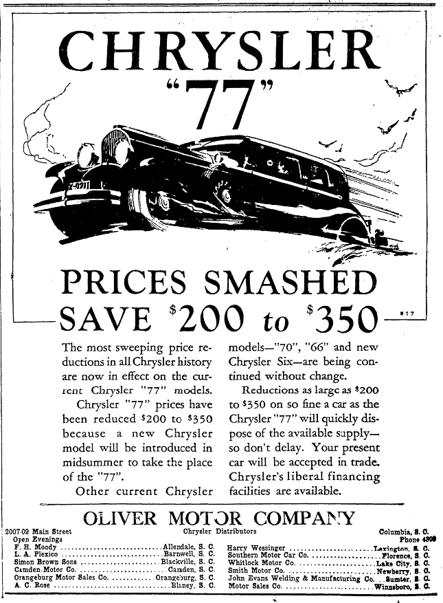 Chrysler “77” prices have been reduced $200 to $350 because a new Chrysler model will be introduced in midsummer to take the place of the “77”.