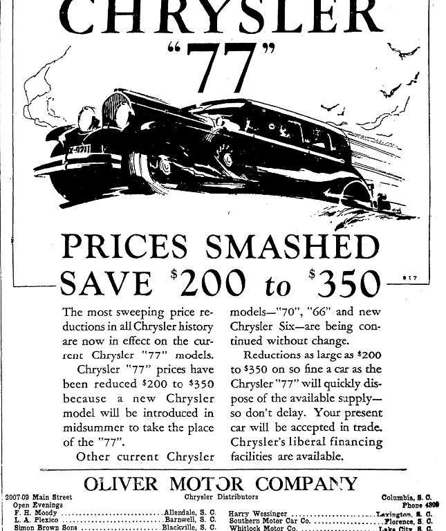 Chrysler “77” prices have been reduced $200 to $350 because a new Chrysler model will be introduced in midsummer to take the place of the “77”.