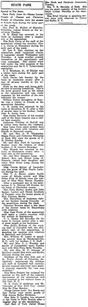 Miss Sallie Brittain of the nursing staff of Campbell hall, the children’s unit of the sanatorium, is spending her vacation with relatives in Barnwell and Columbia.