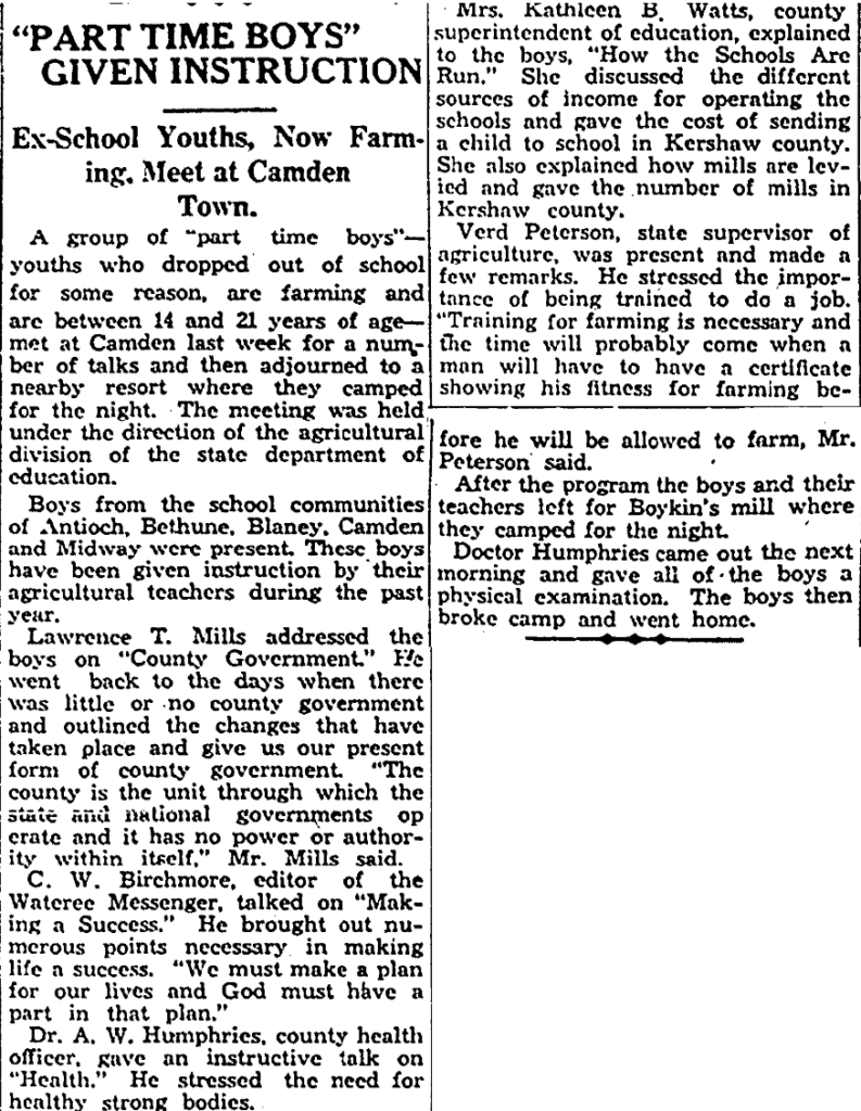 A group of “part time boys” – youths who dropped out of school fro some reason, are farming and are some reason, are farming and are between 14 and 21 years of age-met at Camden last week for a number of talks and then adjourned to nearby resort where they camped for the night. The meeting was held under the direction of the agricultural division of the state department of education.