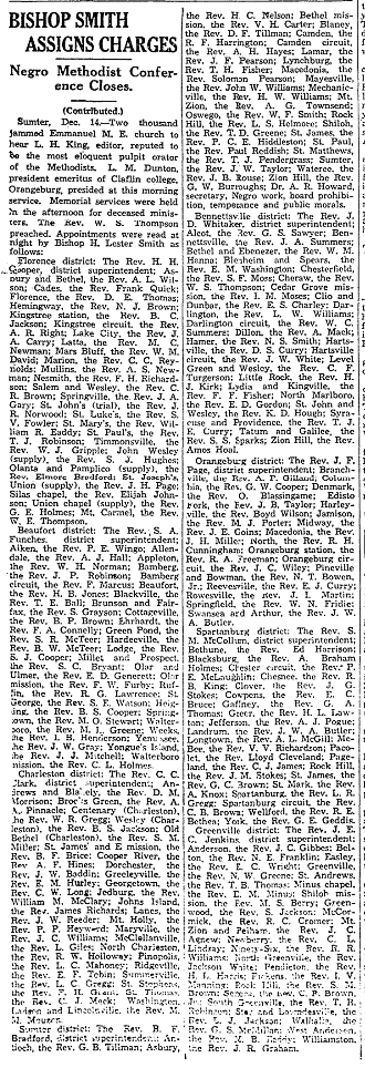 Sumter, Dec. 14. – Two thousand jammed Emmanuel M. E. church to hearl L. H. King, editor, reputed to be the most eloquent pulpit orator of the Methodists, L. M. Dunton, President emeritus of Claflin college, Orangeburg, presided at this morning service. Memorial services where held in the afternoon for deceased ministers. The Rev. W. S. Thompson preached. Appointments were read at night by Bishop H. Lester Smith as follows: