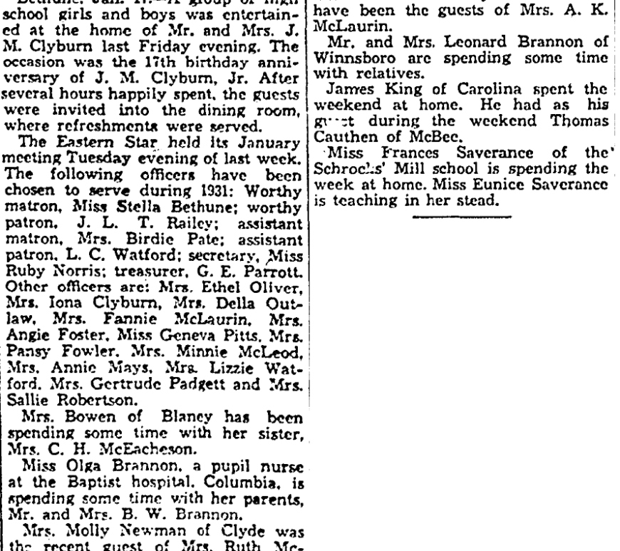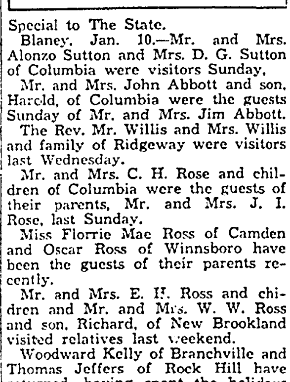 Special to The State. Blaney, Jan. 24 – Miss Greta Garrison of Newton, N. C., is visiting Mrs. L. Branhan. Mrs. Lottie Moak of Great Falls was the weekend guest of her sister, Mrs. Mary A. Price. Miss Lillie Belle Smith of Blythewood was the weekend guest of Miss Eloise Rabon. Mr. and Mrs. L. W. Wages of Bethune visited Mr. and Mrs. J. I. … Continue reading Blaney
