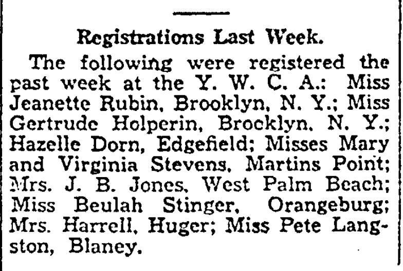 The following were registered the past week at the Y. W. C. A.; Miss Jeanette Rubin, Brooklyn, N. Y.; Miss Gertrude Holperin, Brooklyn, N. Y.; Hazelle Dorn, Edgefield; Misses Mary Stevens and Virginia Stevens, Martins Point; Mrs. J. B. Jones, West Palm Beach; Miss Beulah Stinger, Orangeburg; Mrs. Harrell, Huger; Miss Pete Langston, Blaney.