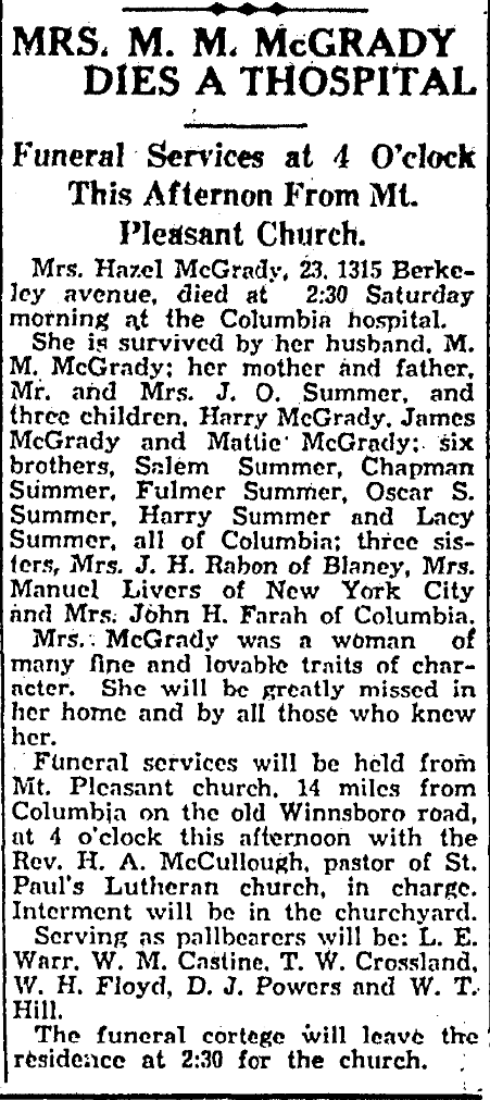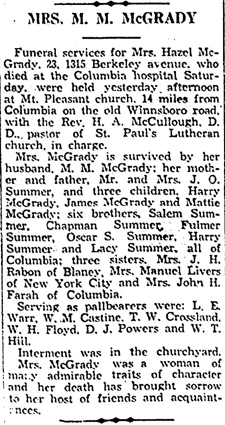 She is survived by her husband, M. M. McGrady; her mother and father, Mr. and Mrs. J. O. Summer, and three children, Harry McGrady, James McGrady and Mattie McGrady; six brothers, Salem Summer, Chapman Summer, Fulmer Summer, Oscar S. Summer, Harry Summer and Lacy Summer, all of Columbia; three sisters, Mrs. J. H. Rabon of Blaney, Mrs. Manuel Livers of New York City and Mrs. John H. Farah of Columbia.