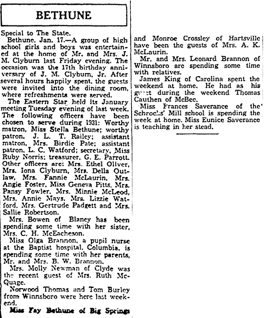 Bethune, Jan 17. – A group of high school girls and boys was entertained at the home of Mr. and Mrs. J. M. Clyburn last Friday evening. The occasion was the 17th birthday anniversary of J. M. Clyburn, Jr. After several hours happily spent, the guests were invited into the dining room, where refreshments were served.