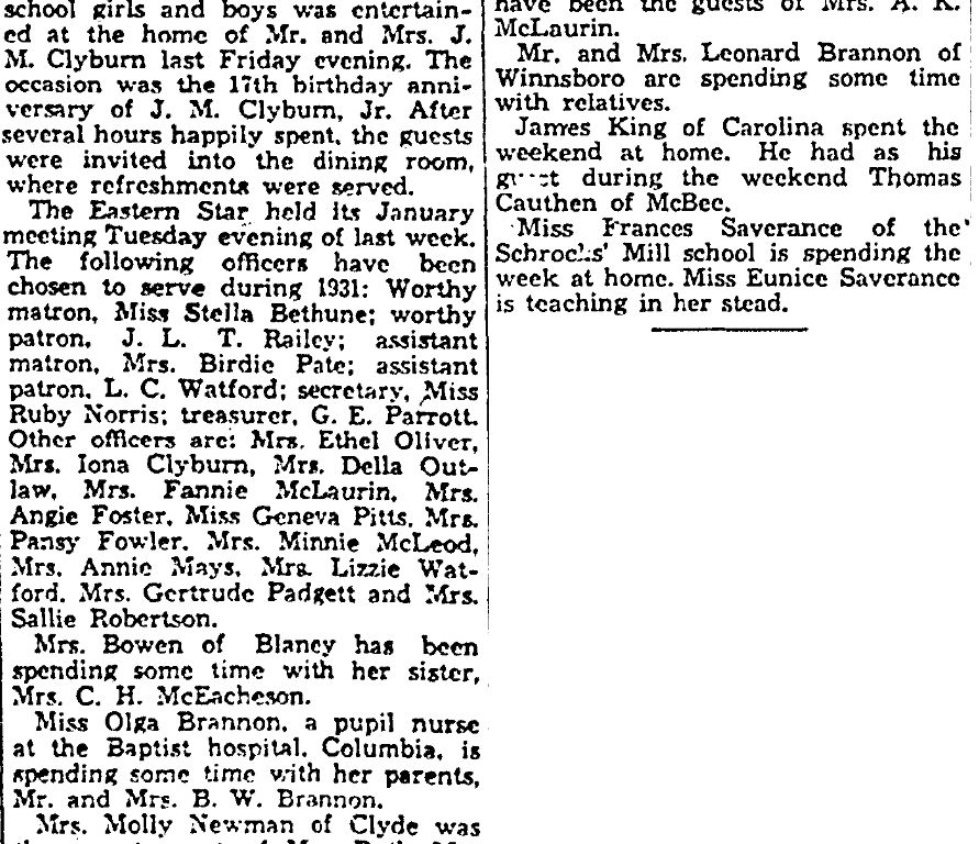 The Eastern Star held its January meeting Tuesday evening of last week. The following officers have been chosen to serve during 1931: Worthy matron, Miss Stella Bethune; worthy patron, J. L. T. Railey; assistant matron, Mrs. Birdie Pate; assistant patron, L. C. Watford; secretary, Miss Ruby Norris; treasurer, G. E. Parrott. Other officers are; Mrs. Ethel Oliver, Mrs. Iona Clyburn, Mrs. Della Outlaw, Mrs. Fannie McLaurin, Mrs. Angie Foster, Miss Geneva Pitts, Mrs. Pansy Fowler, Mrs. Minnie McLeod, Mrs. Mrs. Annie Mays, Mrs. Lizzie Watford, Mrs. Gertrude Padgett and Mrs. Sallie Robertson.