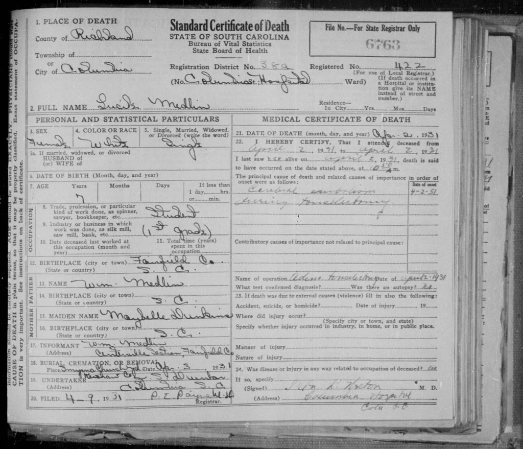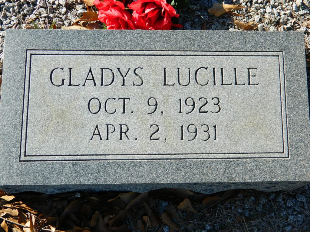 Gladys Medlin was counted in the census on 14 Apr 1930 in Fairfield, South Carolina, USA, as a 6-year-old, single, white, daughter. Also in the home was her father, William Medlin; her mother, Mary Bell Medlin; her siblings, Gertrude Medlin, Charles Medlin, Lois Medlin, and Annie Medlin; and her grandmother, Lillie Medlin.
