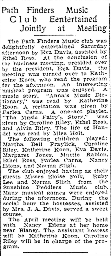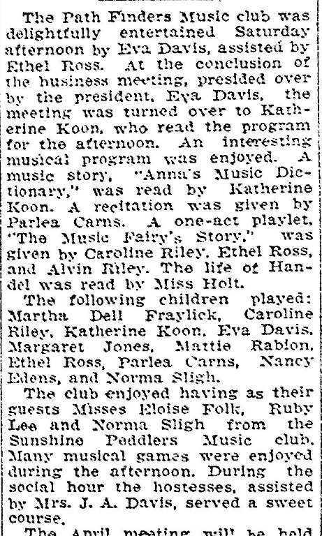 The Path Finders Music club was delightfully entertained Saturday afternoon by Eva davis, assisted by Ethel Ross. At the conclusion of the business meeting presided over by the president, Eva Davis, the meeting was turned over to Katherine Koon, who read the program for the afternoon. An interesting musical program was enjoyed. A musical story “Anna’s Music Dictionary,” was ready by Katherine Koon. A recitation was given by Parlea Carns. A one-act playlet, “The Music Fairy’s Story,” was given by Caroline Riley, Ethel Ross and Alvin Riley. The life of Hadel was read by Miss Holt.