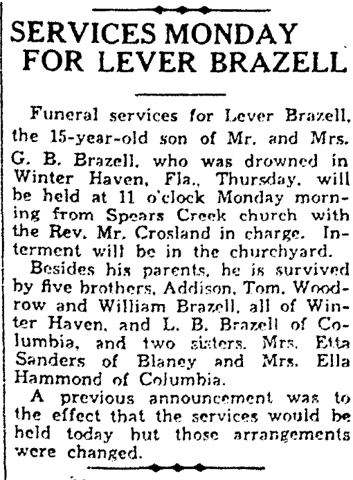 Besides his parents, he is survived by five brothers, Addison Brazell, Tom Brazell, Woodrow Brazell and William Brazell, all of Winter Haven, and L. B. Brazell of Columbia, and two sisters, Mrs. Etta Sanders of Blaney and Mrs. Ella Hammond of Columbia.