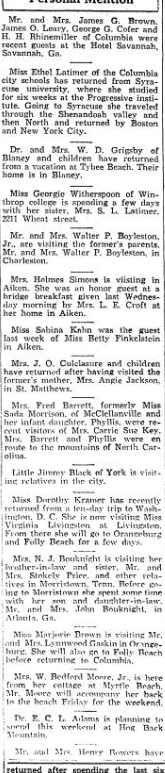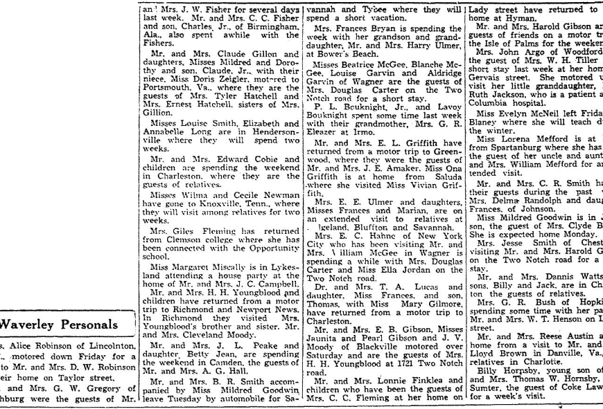 Waverley Personals Mrs. Alice Robinson of Lincolnton, N. C., motored down Friday for a visit to Mr. and Mrs. D. W. Robinson at their home on Taylor street. Mr. and Mrs.G. W. Gregory of Lynchburg were the guest of Mr. and Mrs. J. W. Fisher for several days last week. Mr. and Mrs. C. C. Fisher and son, Charles Jr., of Birmingham. Ala., also spent … Continue reading Society and Clubs