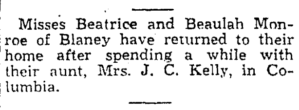 Misses Beatrice Monroe and Beaulah Monroe of Blaney have returned to their home after spending a while with their aunt, Mrs. J. C. Kelly, in Columbia.