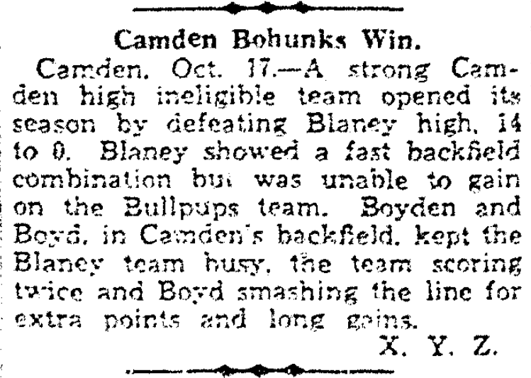 Camden. Oct. 17. – A strong Camden high ineligible team opened its season by defeating Blaney high, 14 to 0. Blaney showed a fast backfield combination but was unable to gain on the Bullpups team. Boyden and Boyd, in Camden’s backfield, kept the Blaney team busy, the team scoring twice and Boyd smashing the line for extra points and long gains.