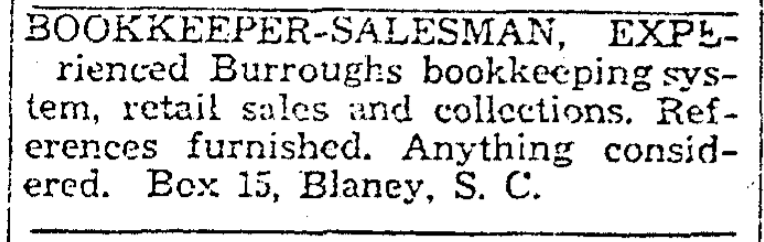BOOKKEEPER – SALESMAN, EXPErienced Burroughs bookkeeping system, retail sales and collections. References furnished. Anything considered. Box 15, Blaney, S. C.