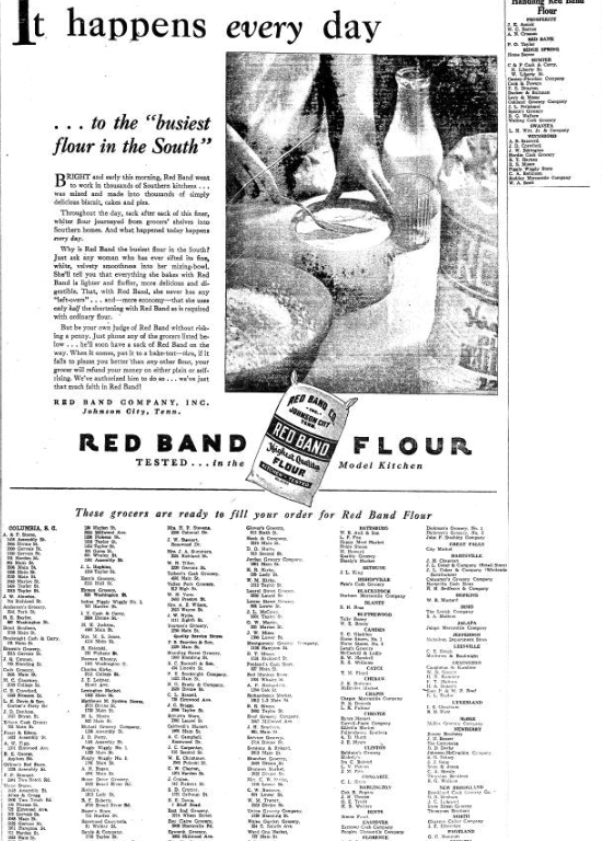 Why is Red Band the busiest flour in the South? Just ask any woman who has ever sifted its fine, white, velvety smoothness into her mixing-bowl. She’ll tell you that everything she bakes with Red Band is lighter an fluffier, more delicious and digestible. That, with Red Band, she never has any “left-overs” . . . and – more economy – that she uses only half the shortening with Red Band as is required with ordinary flour.
