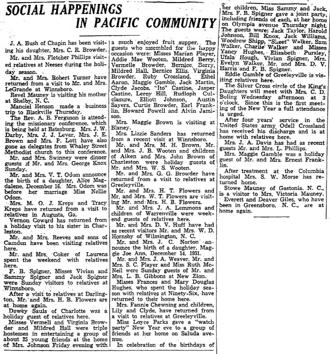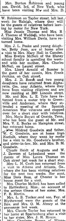 Mrs. Burton Robinson and young son, David, 3rd, of New York, who has been visiting Mr. and Mrs. D. W. Robinson of Taylor street, left last week for Raleigh, where they will be the guests of relatives before leaving by motor for New York. Miss Jennie Thomas and Mrs. R. J. Thomas of Waddell, who have been visiting Mrs. William Davis, have returned home. Mrs. … Continue reading Waverley Personals