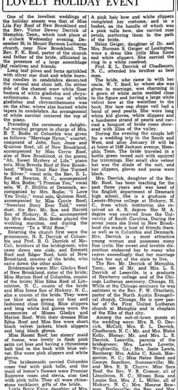 One of the loveliest weddings of the holiday season was that of Miss Lila Fay Roof of New Brookland and the Reverend Victor Dewey Derrick of Memphis, Tennessee, of which took place at 8 o’clock Wednesday evening December 30, in Mount Hermon Lutheran Church, near New Brookland. The Reverend F. K. Roof, pastor of the church and father of the bride, officiated in the presence of a large assemblage of relatives and friends.