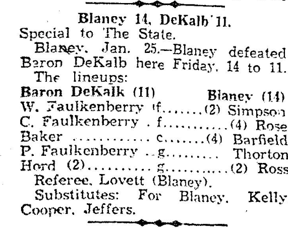 Blaney, Jan. 25. – Blaney defeated Baron DeKalb here Friday, 14 to 11.