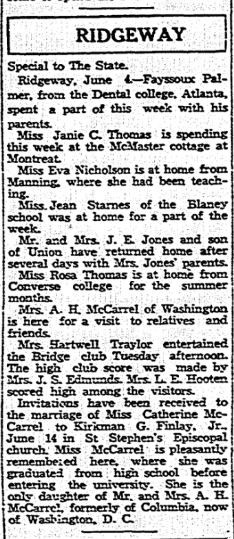 Invitations have been received to the marriage of Miss Catherine McCarrel to Kirkman G. Finlay, Jr., June 14 in St. Stephen’s Episcopal church. Miss McCarrel is pleasantly remembered here, where she was graduated from high school before entering the university. She is the only daughter of Mr. and Mrs. A. H. McCarrel, formerly of Columbia, now of Washington, D. C.