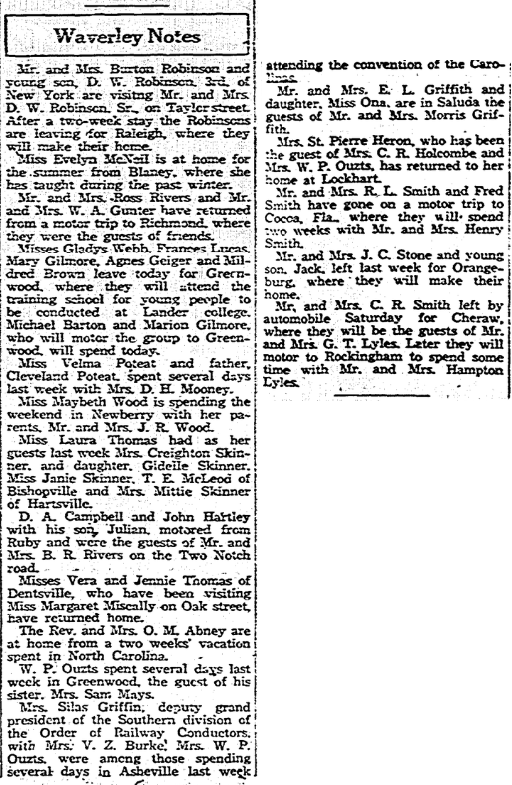 Mrs. Silas Griffin, deputy grand president of the Southern division of the Order of the Railway Conductors, with Mrs. V. Z. Burke, Mrs. W. P. Ouzts, were among those spending several days in Ashville last week attending the convention of the Carolinas.