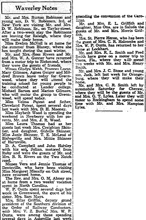 Mrs. Silas Griffin, deputy grand president of the Southern division of the Order of the Railway Conductors, with Mrs. V. Z. Burke, Mrs. W. P. Ouzts, were among those spending several days in Ashville last week attending the convention of the Carolinas.