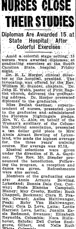 Members of the graduating class are: Annie Arrants Bowling, Lykesland; Bonnie Dale Cox, Conway; Susie Blanche Campbell, Blaney; May Crosby, Ruffin; Ruth Chappell, Bookman; Clara E. Fraley, Coward; Azilee Haltiwanger, Peak; Ruby Van Haltiwanger, Peak; Cora D. Love, Latta; Lottie Harriett Love, Latta; Juanita Essie Redmond, Swansea; Elizabeth Reynolds, Columbia; Nora Ridlehover, Saluda; Dell Curlee Snelgrove, Gilbert, and Nelle Ruth White, Columbia.