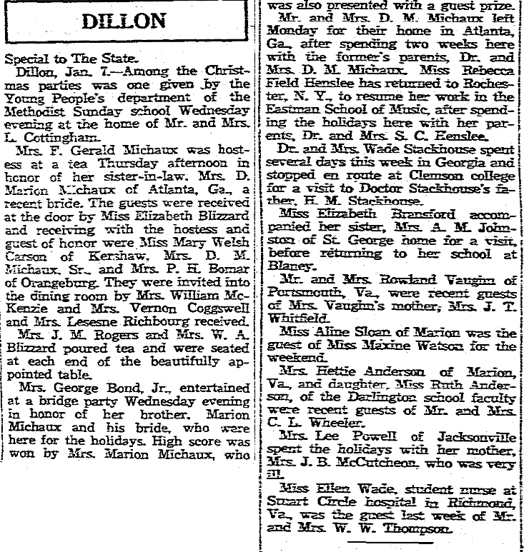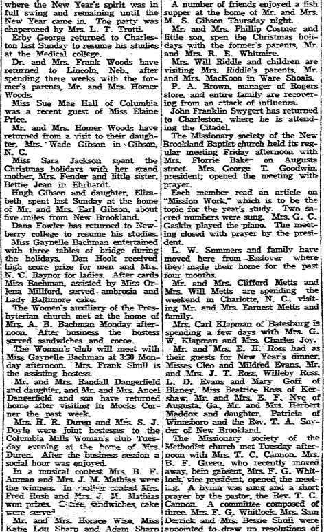 Miss Daisy Lee Walker of Congaree is the weekend guest of her uncle and aunt, Mr. and Mrs. V. Z. Burke, on Hampton Street. Mrs. Lee Kempson is at home from Raleigh, where she has been visiting her son-in-law and daughter, Mr. and Mrs. Whitfield Fowler, for the past two weeks. Mrs. J. J. Younginer has returned to her home at Woodford after a stay … Continue reading Waverley Items