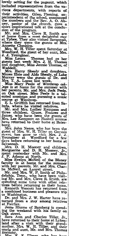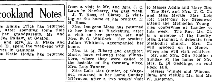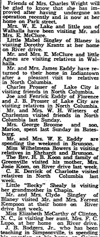 Special to The State. State Park, June 10. – E. L Nichols of Rock Hill, S. E. Miller of Pauline, and W. M. Fox of Wagener, seniors at the South Carolina Medical college, Charleston, arrived Sunday to begin three months internship at the South Carolina sanatorium. J. J. O’Brien of Charleston was Sunday guest of Miss Gertrude Gary, Father Martin Murphy of COlumbia visited Miss … Continue reading State Park