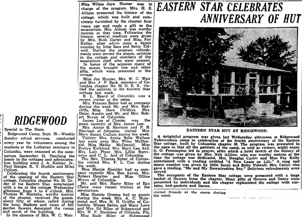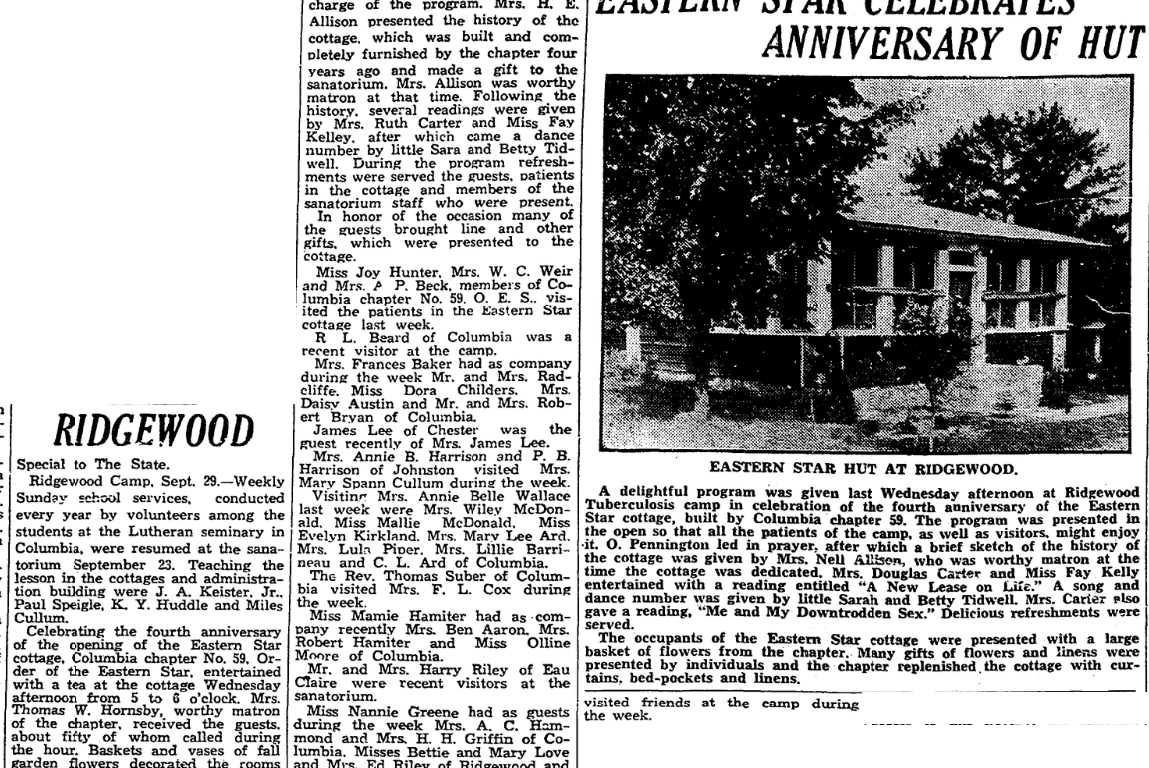 A delightful program was given last Wednesday afternoon at Ridgewood Tuberculosis camp in celebration of the fourth anniversary of the Eastern Star cottage, built by Columbia chapter 59. The program was presented in the open so that all the patients of the camp, as well as visitors, might enjoy it. O Pennington led in prayer, after which a brief sketch of the history of the cottage was given by Mrs. Nell Allison, who was worthy matron at the time the cottage was dedicated. Mrs. Douglas Carter and Miss Fay Kelly entertained with a reading entitled “A New Lease on Life.” A son and dance number was given by little Sara Tidwell and Betty Tidwell. Mrs. Carter also gave a reading, “Me and My Downtrodden Sex.” Delicious refreshments were served.