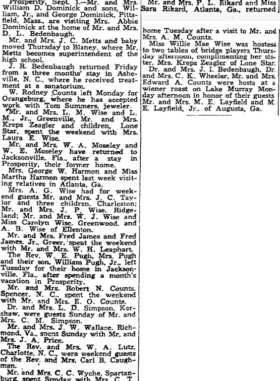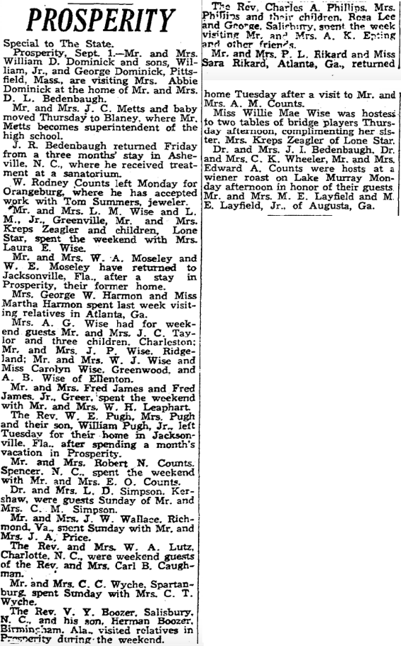 Prosperity, September 1, – Mr. and Mrs. William D. Dominick and sons, William Dominick, Jr., and George Dominick, Pittsfield, Massachusetts., are visiting Mrs. Abbie Dominick at the home of Mr. and Mrs. D. L. Bedenbaugh.