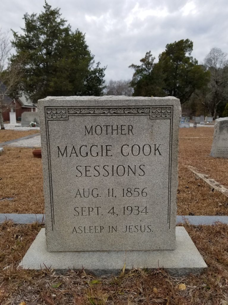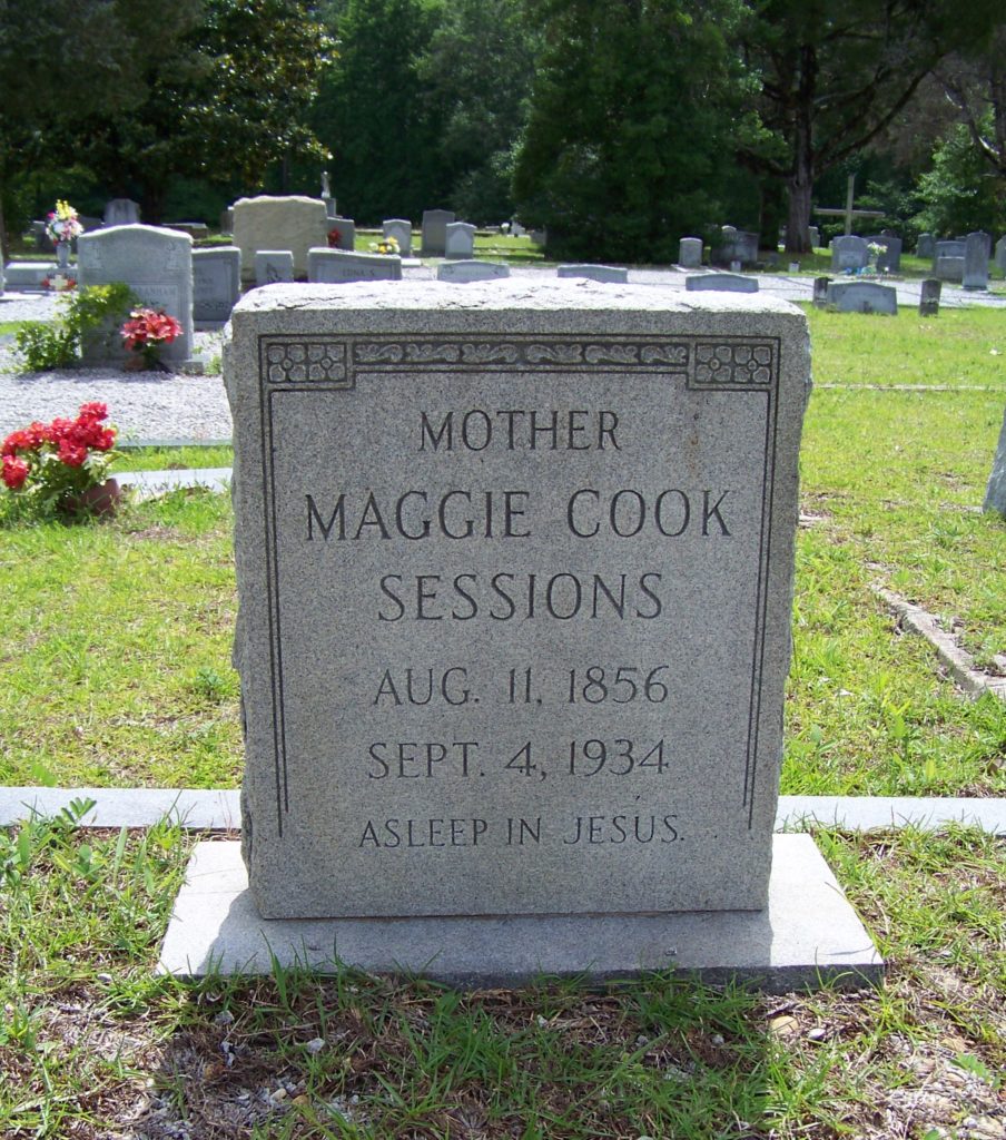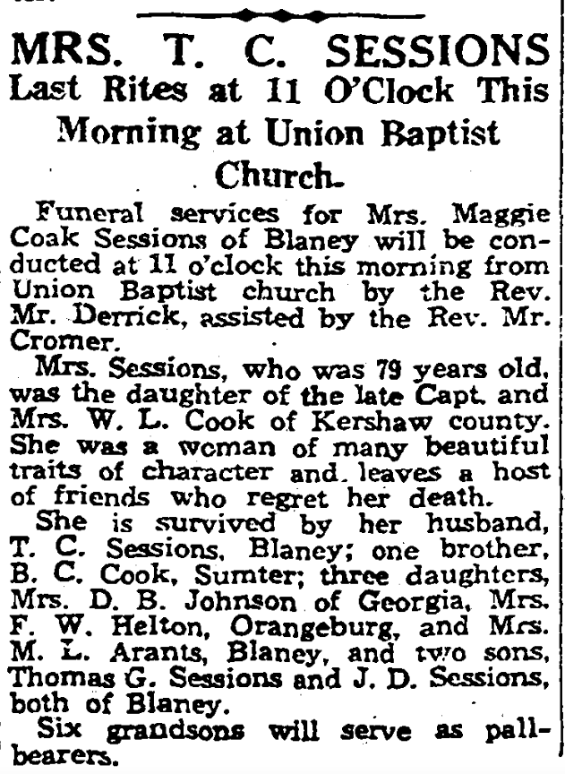 Funeral services for Mrs. Maggie Cook Sessions of Blaney will be conducted at 11 o’clock this morning, September 5, 1934, from Union Baptist Church by the Rev. Mr. Derrick, assisted by the Rev. Mr. Cromer.