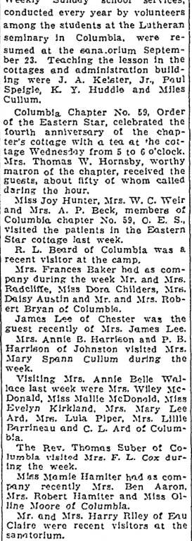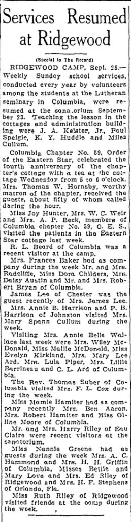 RIDGEWOOD CAMP, Sept. 28 – Weekly Sunday school services, conducted every year by volunteers among the students at the Lutheran seminary in Columbia, were resumed at the sanatorium September 23. Teaching the lesson in the cottages and administration building were J. A. Kelster, Jr., Paul Speigle, K. Y. Huddle and Miles Cullum.