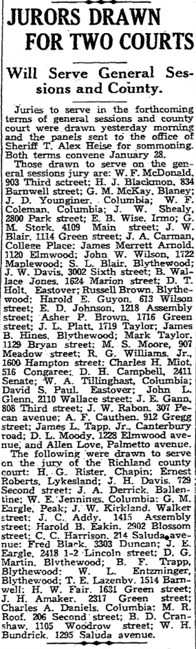 Those drawn to serve on the general sessions jury are W. F. McDonald, 903 Third street; H. J. Blackmon, 834 Barnwell street; G. M. McKay, Blaney route one; J. D. Younginer, Columbia, route two; W. F. Coleman, Columbia, route one; J. W. Shealy, 2800 Park street; E. B. Wise, Irmo, route one; G. M. Stork, 4100 Main street; J. W. Blair, 1114 Green street; J. A. Carman, College Place; James Merrett Arnold, 1120 Elmwood avenue; S. L. Blair, Blythewood; J. W. Davis, 3002 Sixth Avenue; B. Wallace Jones, 1624 Marion street; D. T. Holt, Eastover; Russell Brown, Blythewood; Harold E. Guyon, 613 Wilson street. E. D. Johnson, 1218 Assembly street; Asher P. Brown, 1716 Green street; J. L. Platt, 1719 Taylor street; James B. Hines, Blythewood; Mark Taylor, 1129 Bryan street; M. S. Moore, 907 Meadow street; R. G. Williams, Jr., 1600 Hampton street; Charles H. Miot, 516 Congaree Avenue; D. H. Campbell, 2411 Senate street; W. A. Tillinghast, Columbia, route three, David S. Paul, Eastover; John L. Glenn, 2110 Wallace street; J. E. Gann, 808 Third street; J. W. Rabon, 307 Pecan street, A. F. Cauthen, 912 Gregg street; James L. Tapp, Jr., Canterberry road; D. L. Mobley, 1228 Elmwood avenue; Allen Love, Palmetto.