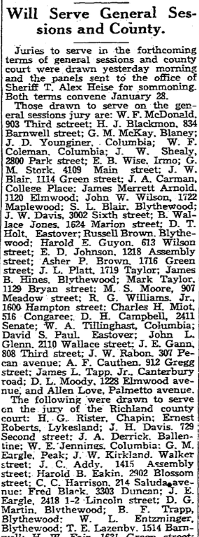 Those drawn to serve on the general sessions jury are W. F. McDonald, 903 Third street; H. J. Blackmon, 834 Barnwell street; G. M. McKay, Blaney route one; J. D. Younginer, Columbia, route two; W. F. Coleman, Columbia, route one; J. W. Shealy, 2800 Park street; E. B. Wise, Irmo, route one; G. M. Stork, 4100 Main street; J. W. Blair, 1114 Green street; J. A. Carman, College Place; James Merrett Arnold, 1120 Elmwood avenue; S. L. Blair, Blythewood; J. W. Davis, 3002 Sixth Avenue; B. Wallace Jones, 1624 Marion street; D. T. Holt, Eastover; Russell Brown, Blythewood; Harold E. Guyon, 613 Wilson street. E. D. Johnson, 1218 Assembly street; Asher P. Brown, 1716 Green street; J. L. Platt, 1719 Taylor street; James B. Hines, Blythewood; Mark Taylor, 1129 Bryan street; M. S. Moore, 907 Meadow street; R. G. Williams, Jr., 1600 Hampton street; Charles H. Miot, 516 Congaree Avenue; D. H. Campbell, 2411 Senate street; W. A. Tillinghast, Columbia, route three, David S. Paul, Eastover; John L. Glenn, 2110 Wallace street; J. E. Gann, 808 Third street; J. W. Rabon, 307 Pecan street, A. F. Cauthen, 912 Gregg street; James L. Tapp, Jr., Canterberry road; D. L. Mobley, 1228 Elmwood avenue; Allen Love, Palmetto.