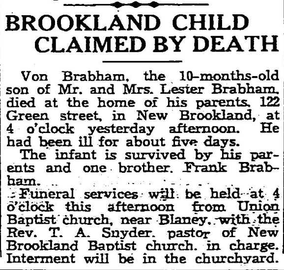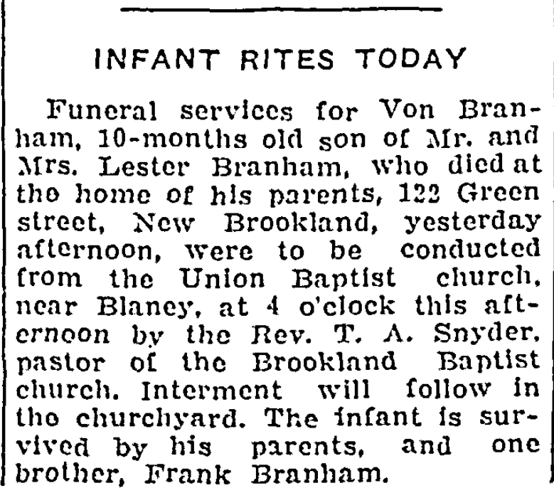 Funeral services for Von Branham, 10-months old son of Mr. and Mrs. Lester Branham, who died at the home of his parents, 122 Green street, New Brookland, yesterday afternoon, were to be conducted from the Union Baptist church, near Blaney, at 4 o’clock this afternoon by the Rev. T. A. Snyder, pastor of the Brookland Baptist church. Interment will follow in the churchyard. The infant is survived by his parents, and one brother, Frank Branham.