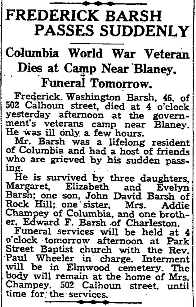 Frederick Washington Barsh, 46, of 502 Calhoun street, died at 4 o’clock yesterday afternoon at the government’s veterans camp near Blaney. He was ill only a few hours.