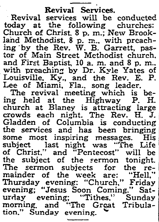 The revival meeting which is being held at the Highway P. H. Church at Blaney is attracting large crowds each night. The Rev. H. J. Gladden of Columbia is conducting the services and the service and has been bringing some most inspiring messages. His subject last night was “The Life of Christ,” and “Pentecost” will be the subject of the sermon tonight. The sermon subjects for the remainder of the week are: “Hell,” Thursday evening: “Church,” Friday evening: “Jesus Soon Coming.” Saturday evening; “Tithes.” Sunday morning and “The Great Tribulation.” Sunday evening.