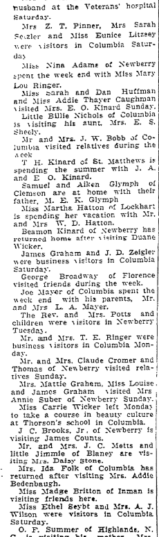 (Special to The Record) POMARIA, June 6. – Mr. and Mrs. R. L. Riser and children have returned home after visiting Mrs. Riser’s parents. Mr. and Mrs. G. S. Williams. Mrs. T. M. Boland visited her husband at the Veterans’ hospital Saturday. Mrs. Z. T. Pinner, Mrs. Sarah Sezler and Miss Eunice Litzsey were visitors in Columbia Saturday. Miss Nina Adams of Newberry spent the … Continue reading People of Pomaria Greet Visitors