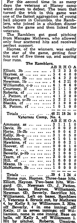 For the second time in as many days the veterans at Blaney camp went down to defeat. The team that turned the trick in this game was one of the fastest aggregation of young ball players in Columbia. The Ramblers, who joined in a chicken dinner before the game and then licked the veterans. The Ramblers got good pitching from Manager Mathews, who allowed on … Continue reading Ramblers Beat Blaney Veterans
