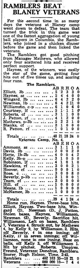 Home run, Haynes. Three-base hits, Elliott, Haynes. Two-base hits, Wingard (2), Newman (2), J. Patton, Stolen bases, Haynes. Williamson, Newman (2). Beverly. Sacrifice hit. Williamson. Left on bases. Ramblers 7, Verterans 4. Struck out, by Mathews 4, by Kelly 9. by Williamson 1. Hit by pitcher, Roberts. Umpires. Freund, Veterans; Donohue, Ramblers, Scorer. Hugh Holson, Time. 2:45.