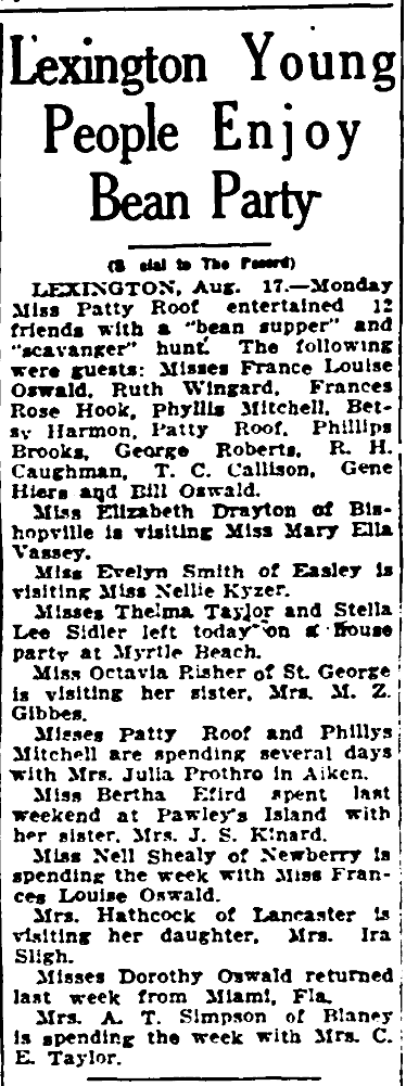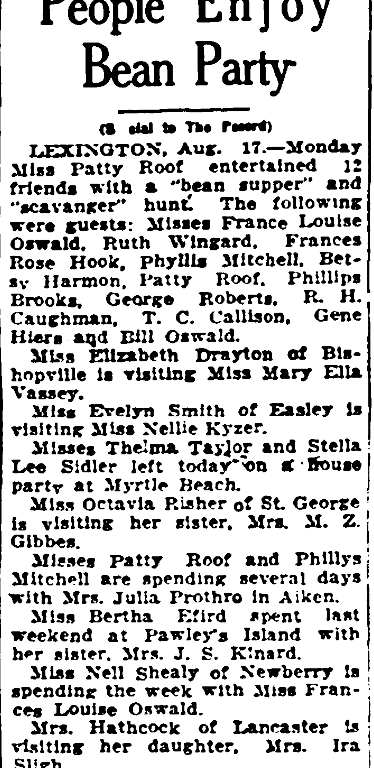 LEXINGTON, Aug. 17. – Monday Miss Patty Roff entertained 12 friends with a “bean supper’ and “Scavenger” hunt. The following were guest: Misses France Louise Oswald, Ruth Wingard, Frances Rose Hook, Phyllis Mitchell, Betsy Harmon, Patty Roof, Phillips Brooks, George Roberts, R. H. Caughman, T. C. Callison, Gene Hiers and Bill Oswald.