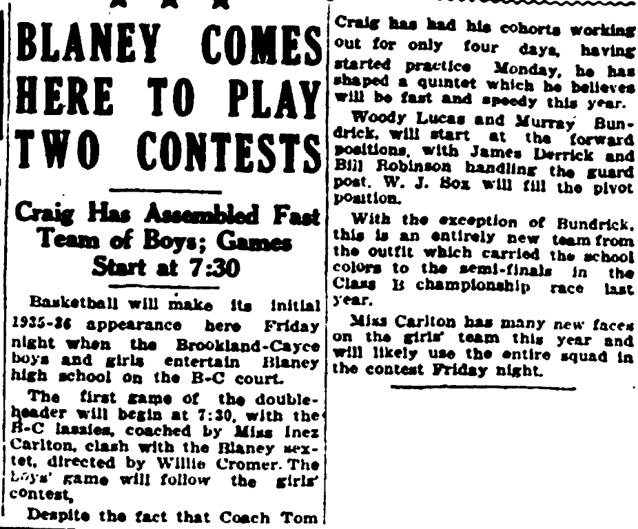 Basketball will make its initial 1935-36 appearance here Friday night when the Brookland-Cayce boys and girls entertain Blaney high school on the B-C court.