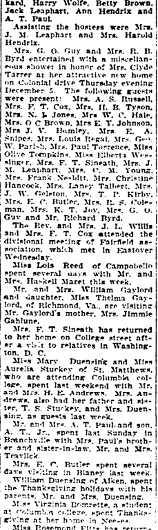 Mrs. G. O. Guy and Mrs. R. B. Byrd entertained with a miscellaneous shower in honor of Mrs. Clyde Tarrer at her attractive new home on Colonial drive Thursday evening December 5. The following guests were present: Mrs. A. S. Russell, Mrs. F. T. Cox, Mrs. H. B. Tyson, Mrs. N. I. Jones, Mrs. W. C. Hale, Mrs. O. C. Brown, Mrs. E. Y. Johnson, Mrs. J. V. Hamley, Mrs. E. A. Snipes, Mrs. Louis Regal, Mrs. Geo. W. Parish, Mrs. Paul Torrence, Miss Olive Tompkins, Miss Elberta Wessinger, Mrs. F. T. Sineath, Mrs. J. M. Leaphart, Mrs. C. M. Young, Mrs. Frank Nesbitt, Mrs. Christine Hancock, Mrs. Laney Talbert, Mrs. J. W. Gelston, Mrs. T. P. Kirby, Mrs. E. C. Butler, Mrs. R. S. Coleman, Mrs. K. T. Joy, Mrs. G. O. Guy and Mr. Richard Byrd.