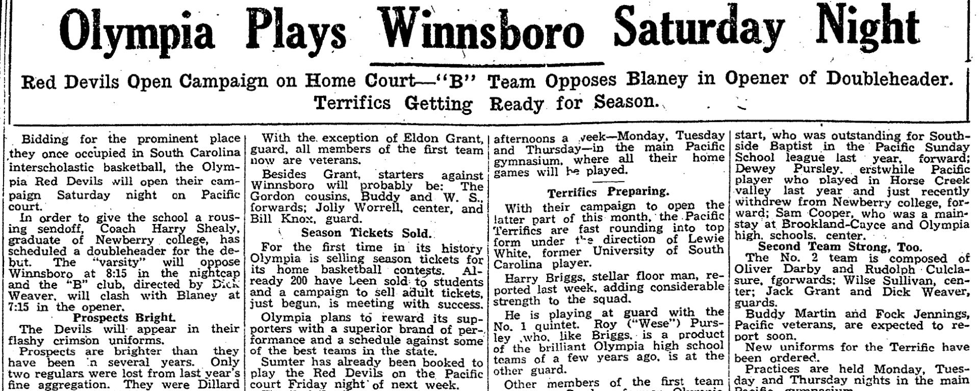 Others members of the first team are James Gordon, former Olympia start, who was outstanding for Southside Baptist in the Pacific Sunday School league last year, forward; Dewey Pursley, erstwhile Pacific player who played in Horse Creek valley last year and just recently withdrew from Newberry college, forward; Sam Cooper, who was a main-stay at Brookland-Cayce and Olympia high school center.