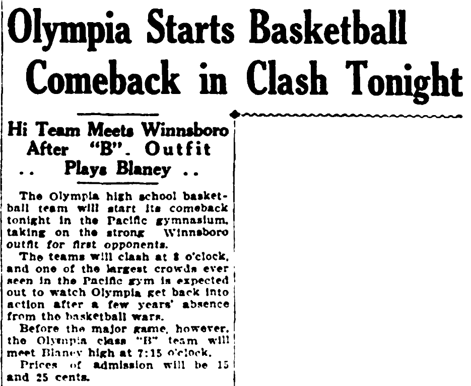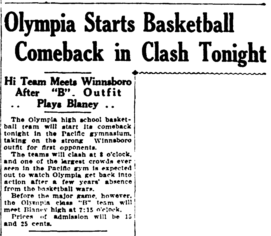 Before the major game, however, the Olympia class “B” team will meet Blaney high at 7:15 o’clock.