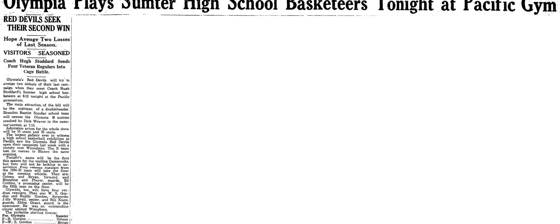 Olympia, too, will have four veteran regulars. They are: W. S. Gordon and Buddy Gordon, forwards; Jolly Worrell, center, and Bill Knox, guards, Eldon Grant, guard, is the newcomer. He was an outstanding player against Winnsboro.