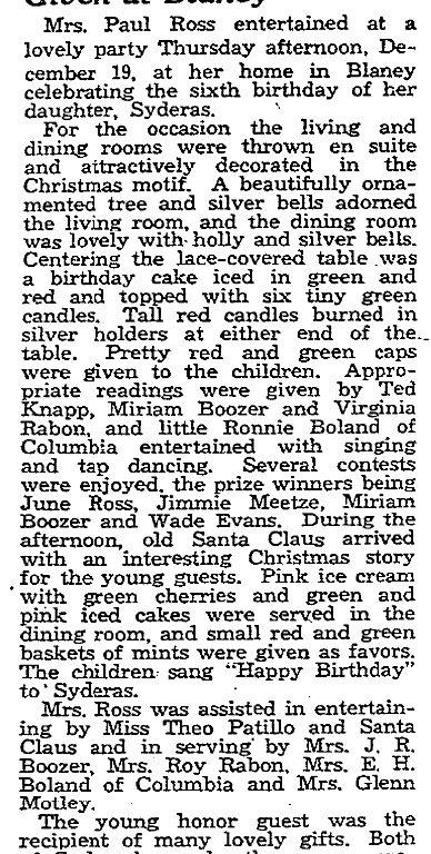 For the occasion the living and dining rooms were thrown en suite and attractively decorated in the Christmas motif. A beautifully ornamented tree and silver bells adorned the living room, and the dining room was lovely with holly and silver bells. Centering the lace-covered table was a birthday cake iced in green and red and topped with six tiny green candles. Tall red candles burned in silver holders at either end of the table. Pretty red and green caps were given to the children. Appropriate reading were given by Ted Knapp, Miriam Boozer and Virginia Rabon, and little Ronnie Boland of Columbia entertained with singing and tap dancing. Several contests were enjoyed, the prize winner being June Ross, Jimmie Meetze, Miriam Boozer and Wade Evans. During the afternoon, old Santa Claus arrived with an interesting Christmas story for the young guest. Pink ice cream with green cherries and green and pink iced cakes were served in the dining room, and small red and green baskets of mints were given as favors. The children sang “Happy Birthday” to Syderas.